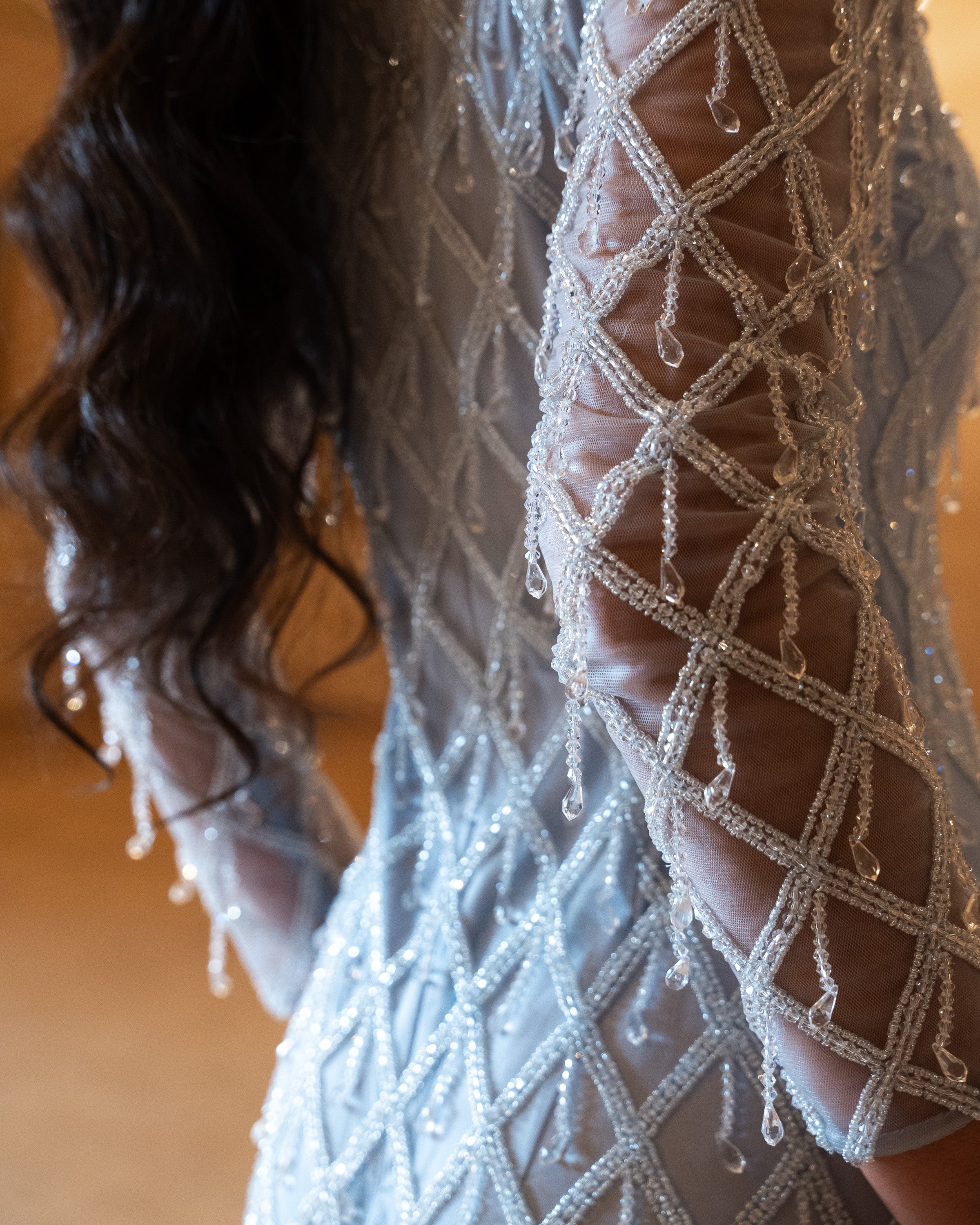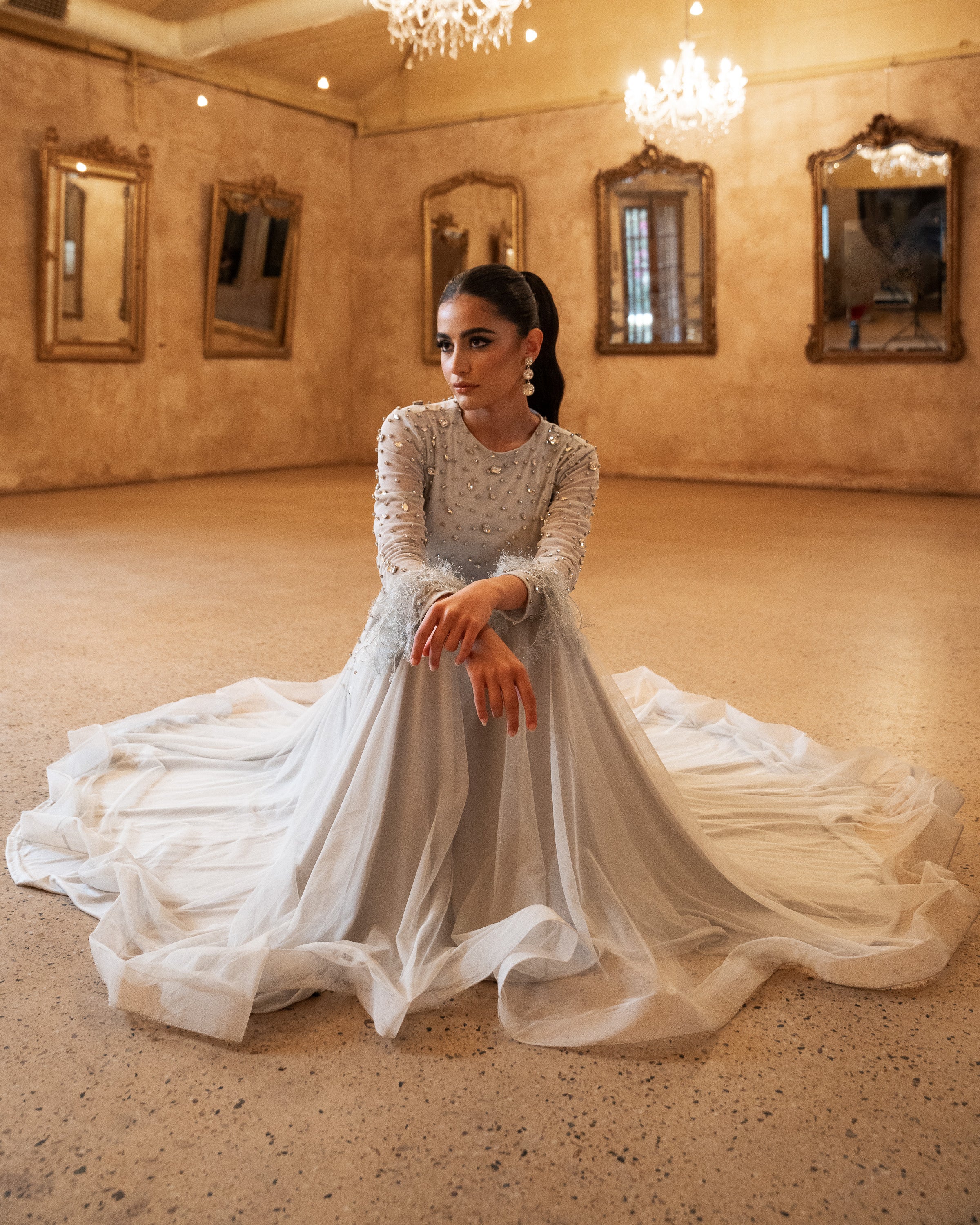 ‘ALMAS’ BLUE GREY STATEMENT CHAPEL TRAIN DRESS WITH DANGLING DIAMANTÉ