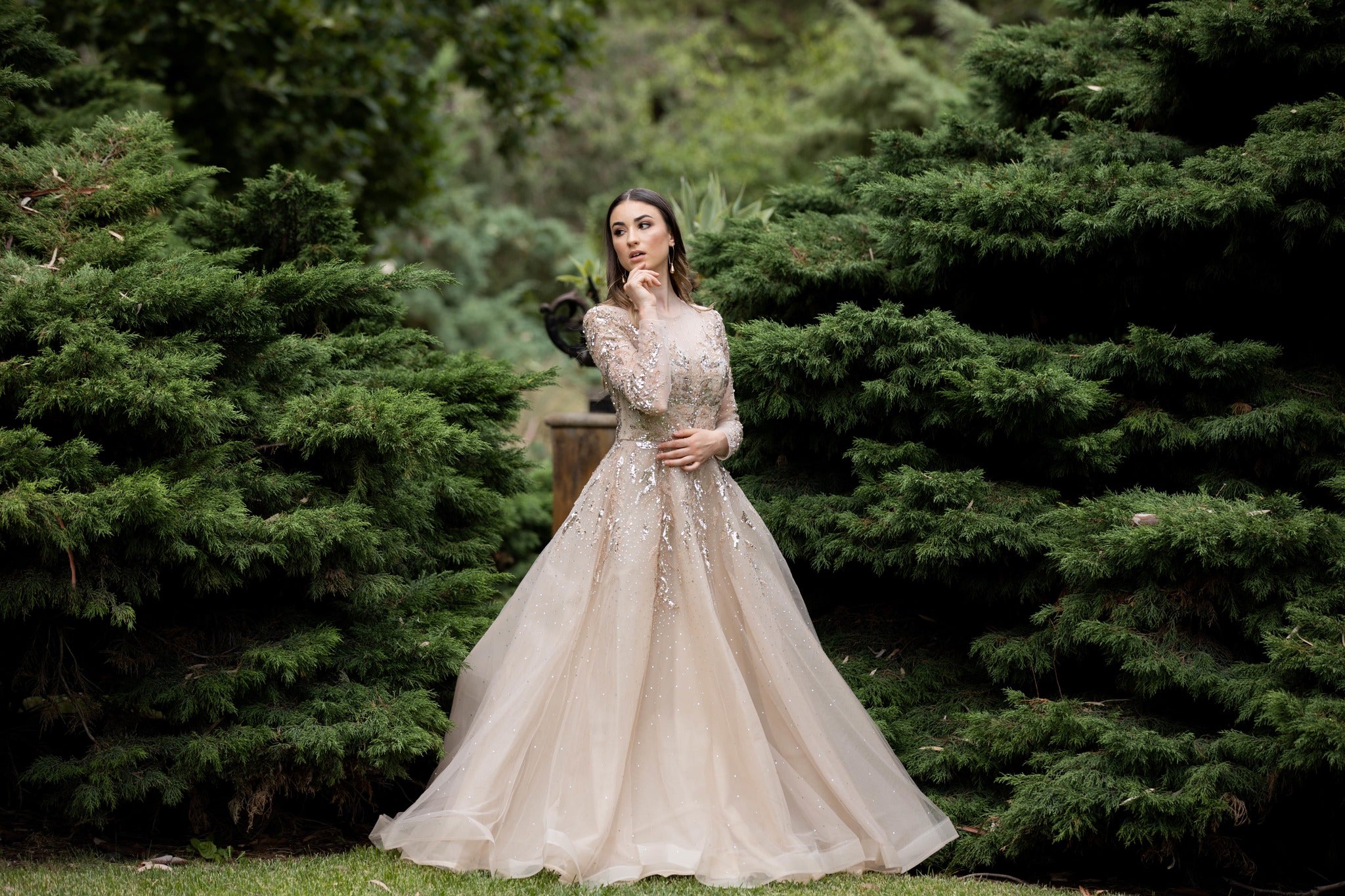 'PARI' ALMOND EMBELLISHED MAXI DRESS WITH FLARED SLEEVES