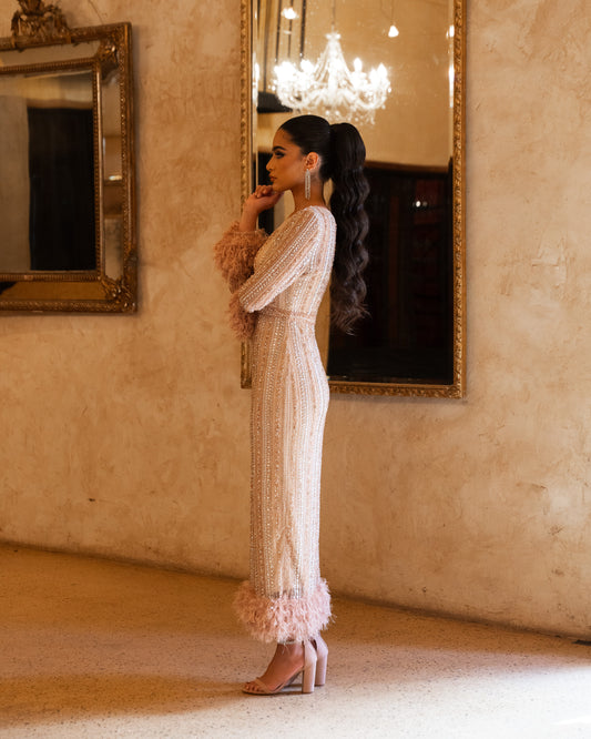 ‘IRIS ROSE GOLD’ MIDI DRESS WITH FEATHER CUFFS AND HEM