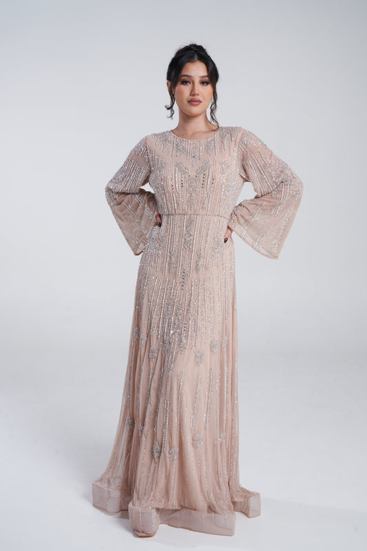 MADE TO ORDER ONLY: 'PARI' ALMOND EMBELLISHED MAXI DRESS WITH FLARED SLEEVES (3 weeks wait)