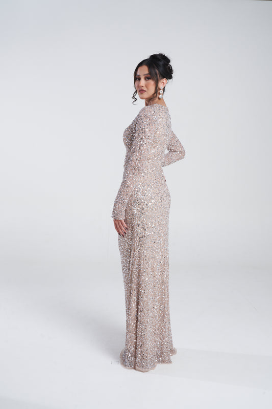 MADE TO ORDER ONLY: 'ZARI BEIGE' EMBELLISHED DRAPE MAXI DRESS (3 weeks wait)