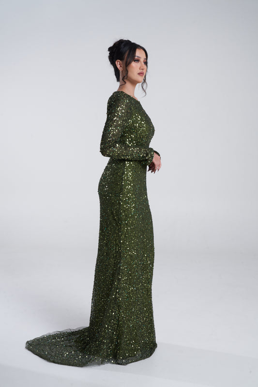 MADE TO ORDER ONLY: 'MEHER' DEEP GREEN EMBELLISHED SEQUIN DRESS WITH TRAIL (3 weeks wait)