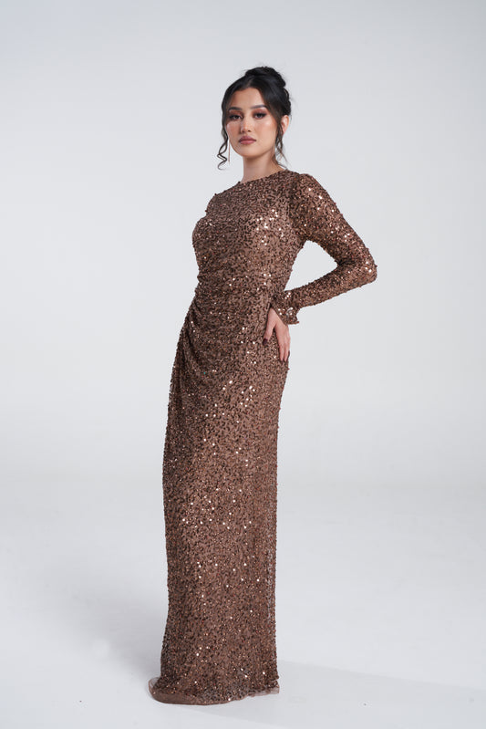 MADE TO ORDER ONLY: 'ZARI BROWN' EMBELLISHED DRAPE MAXI DRESS (3 weeks wait)