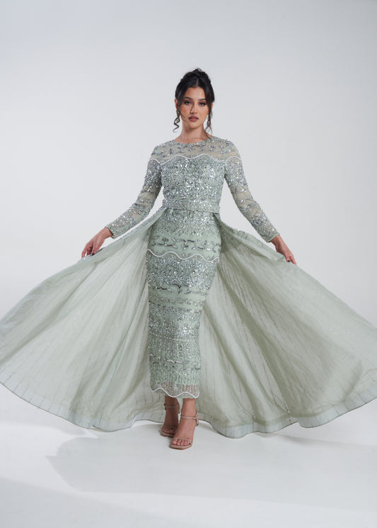 MADE TO ORDER ONLY: 'SAGE NOOR' EMBELLISHED MIDI DRESS WITH DETACHABLE SKIRT (3 weeks wait)