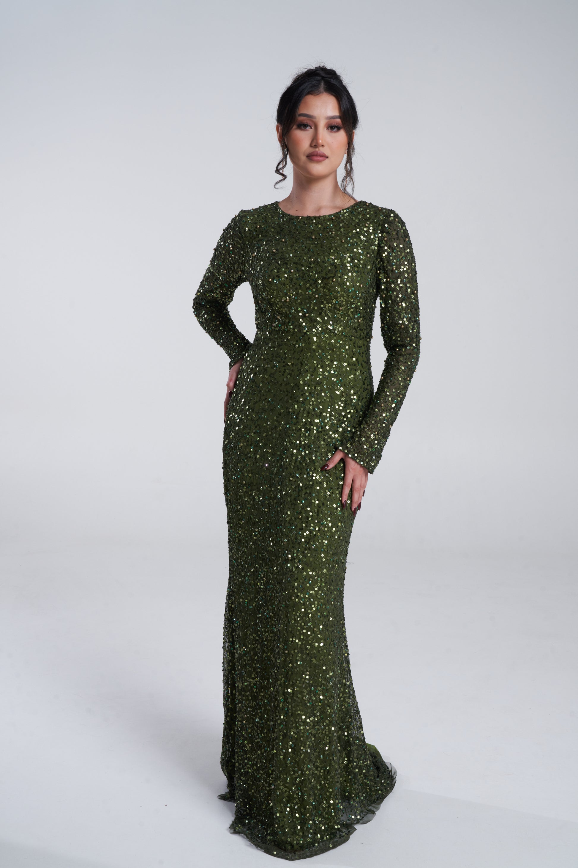 Command attention in Meher, a figure-hugging gown designed for luminous moments. Hand-embellished with shimmering deep green sequins and pearls, this gown celebrates understated opulence. The long sleeves and floor-length silhouette are balanced by a subtle trail, creating graceful movement with every step. Meher is fully lined for comfort and sculpted to flatter the form.